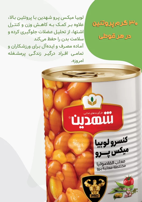 کنسرو لوبیا میکس پرو، محصولی از برند شهدین هلدینگ شیفته آرای شرق ترکیبی است از لوبیا، نخود آبگوشتی و دال عدس که در هر وعده مصرفی، ۳۰ گرم پروتئین را به بدن ارائه میدهد. این محصول نه تنها به نیاز پروتئینی روزانه افراد پاسخ میدهد، بلکه به عنوان یک غذای کامل و سالم، برای اصلاح رژیم غذایی و حمایت از سلامت مصرفکنندگان طراحی شده است.